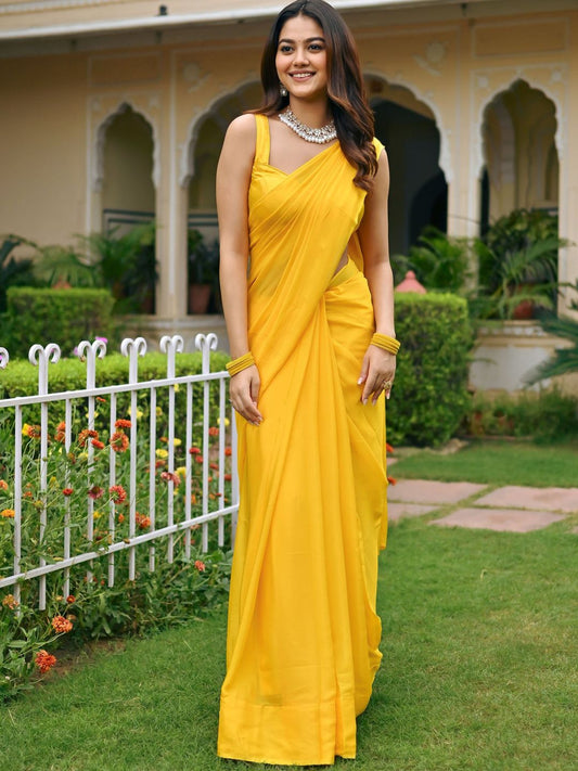 Dear ready to wear saree lovers, here is a simple, but darling, the elegant yellow Satin Georgette saree from Flipthestyle. Made for the modern saree for woman, this plain yet stunning drape offers endless options for styling. This saree is perfect for any occasion whether it is for a Haldi ceremony, a festive celebration or just a casual day out. Effortless elegance and sunshine are what this saree will add to your wardrobe.