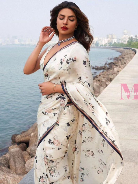 Saree for women who loves simplicity and elegance, this White Satin Georgette saree from Flipthestyle is a lovely option for a festive morning, brunch or elegant afternoon or evening gathering. It is made with an exquisitely soft Satin Georgette, with a delicate floral digital print that gives it a subtle elegance combined with a fresh, modern quality.